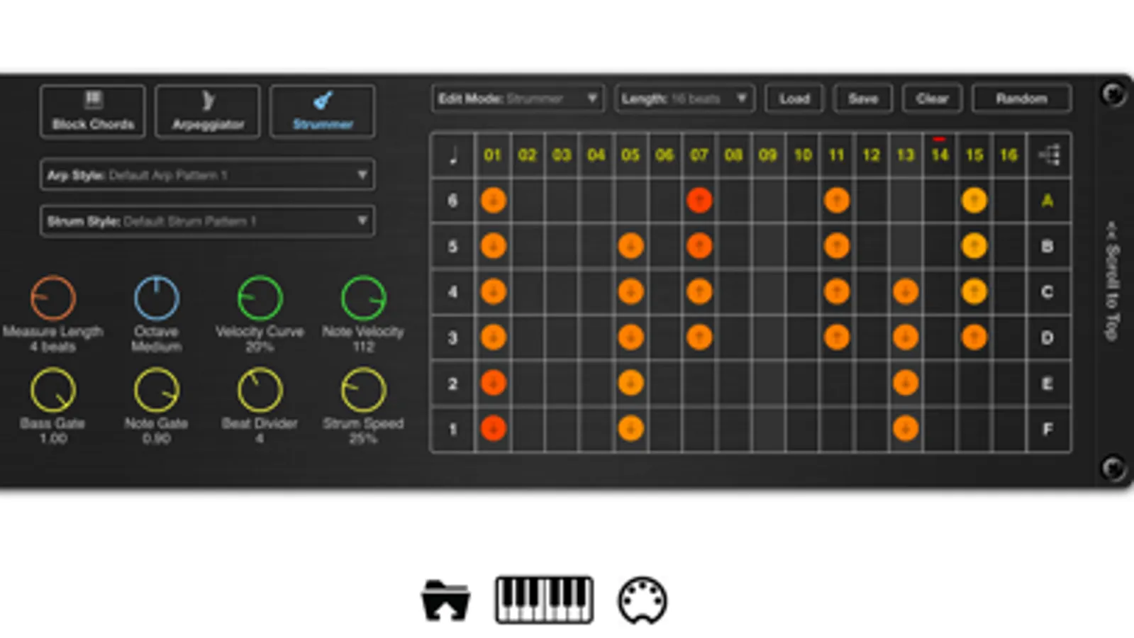 Progressions also features an integrated arpeggiator and strummming pattern editor. You can load up to 6 arp and 6 strum patterns at the same time and seemlessly switch between them manually, remotely, or using song mode.
