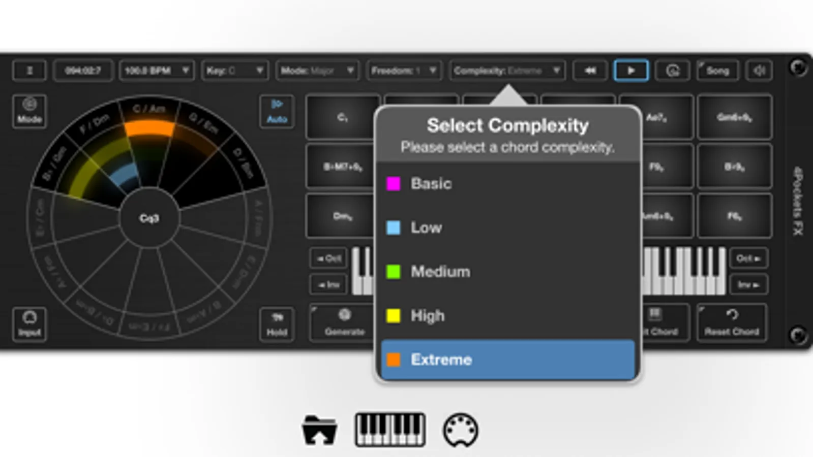 The complexity level start off at Basic, which uses only the most common chords (I, IV, V and relative minor ii, iii, and vi triads). As you progress through the levels, you can add parallel majors and minors, sus and dom chords etc. At level 3 we start to introduce 6th and 7th chords, and then 9ths chords, all the way to 11ths, 13ths, Quartals and all their variations.