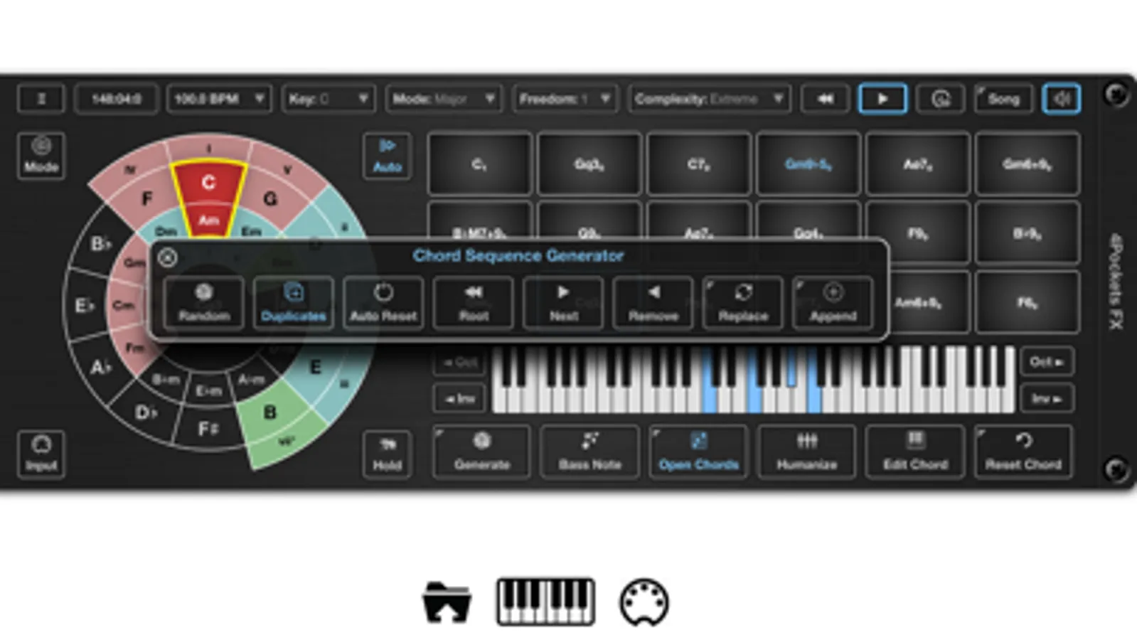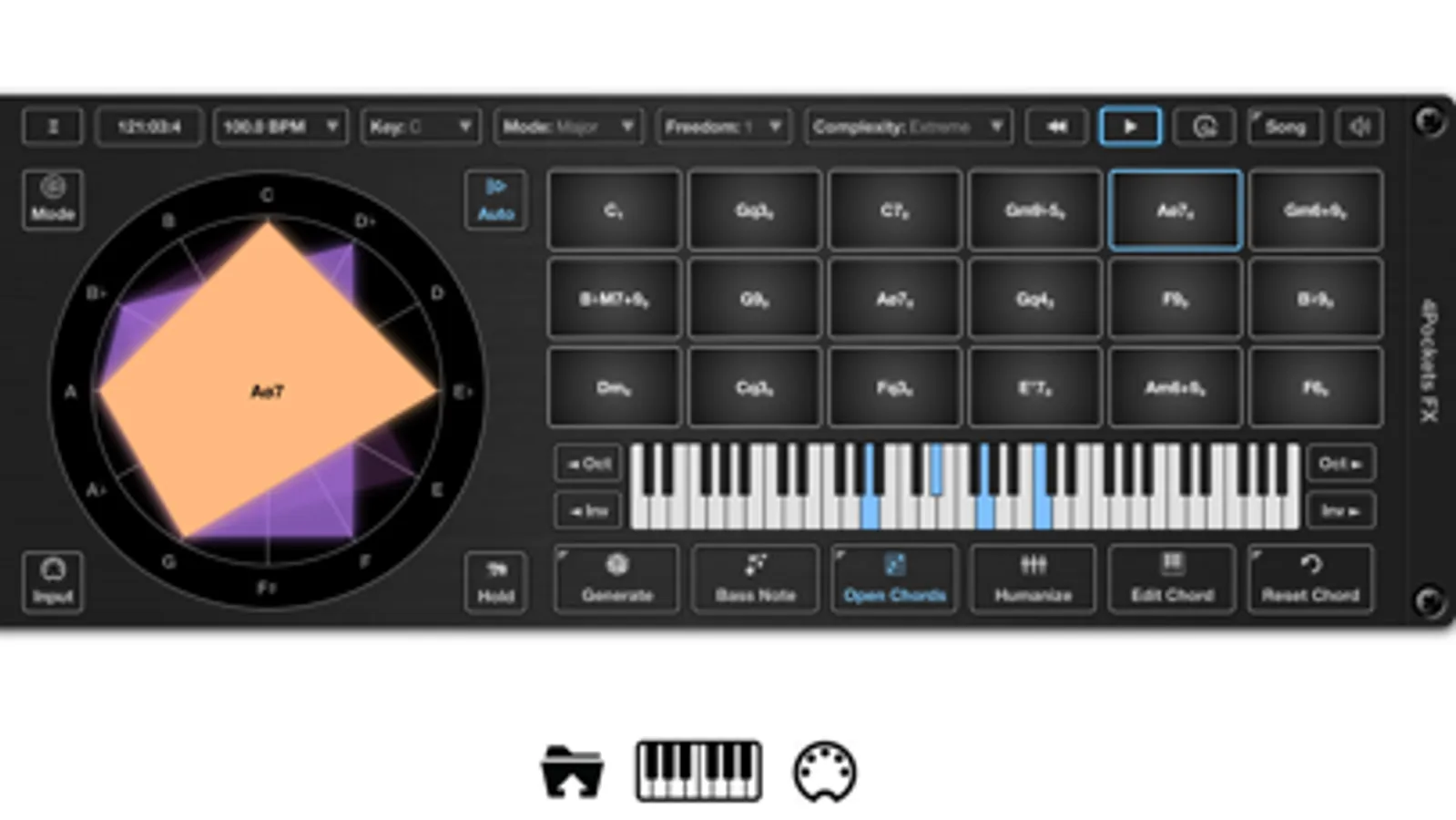 Progressions allows you to quickly randomize a toolbox of chords, that can be played in a variety of modes (block chords, arpeggiated, or strummed). These can be synced to a host application, triggered remotely or pieced together into a song.