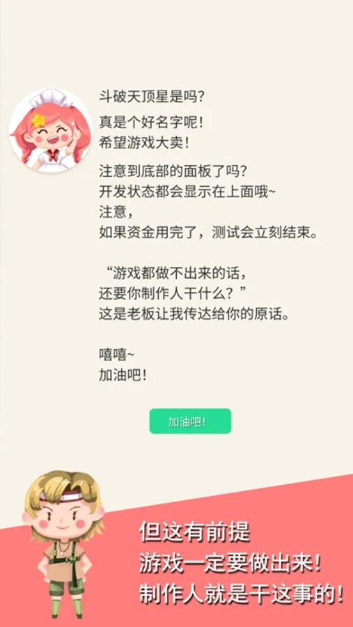 请注意,每次选择都将影响游戏质量、预算等等重要指标。你固然可以选择一些自己期望的行为,但别忘了,作为制作人,你还要对项目负责,做不出来,或者做不好,都是你的责任。让我们再来看下一个事件: