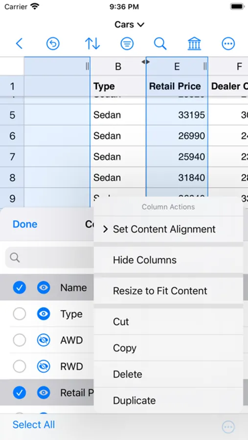 • Perform various actions on a single or multiple columns: cut copy, delete, duplicate, sort, hide & more