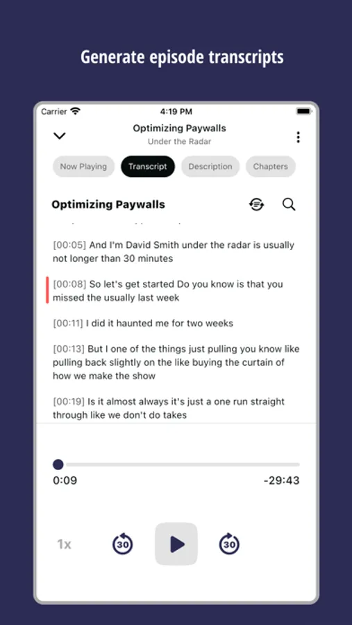 Automated transcripts are generated directly on device. Because of that, each user who generates transcripts collectively adds to a growing database of available transcripts. Together, we are engaging with podcast content in new and collaborative ways.