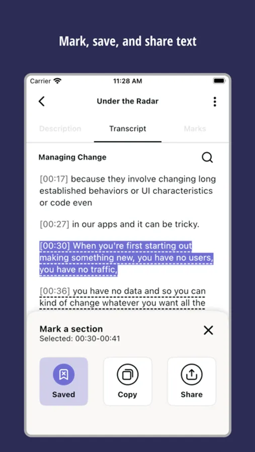 We are a podcast player that transcribes podcast episodes. We also make it easy to mark, save and share sections of transcribed text. The next time you want to recall that one part from that one episode, you can!