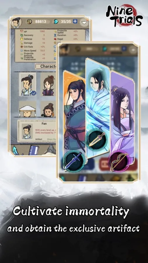 Nine Trials is a casual musou-style game with an eastern fantasy setting. Through deft maneuvering, you overcome the onslaught of monsters in Fairyland. Too many monsters? Don't worry! Utilize your Artifacts, as they can be augmented or even transformed into primordial Artifacts by absorbing Souls in battle, aiding you in surviving the Nine Trials and attaining immortality!