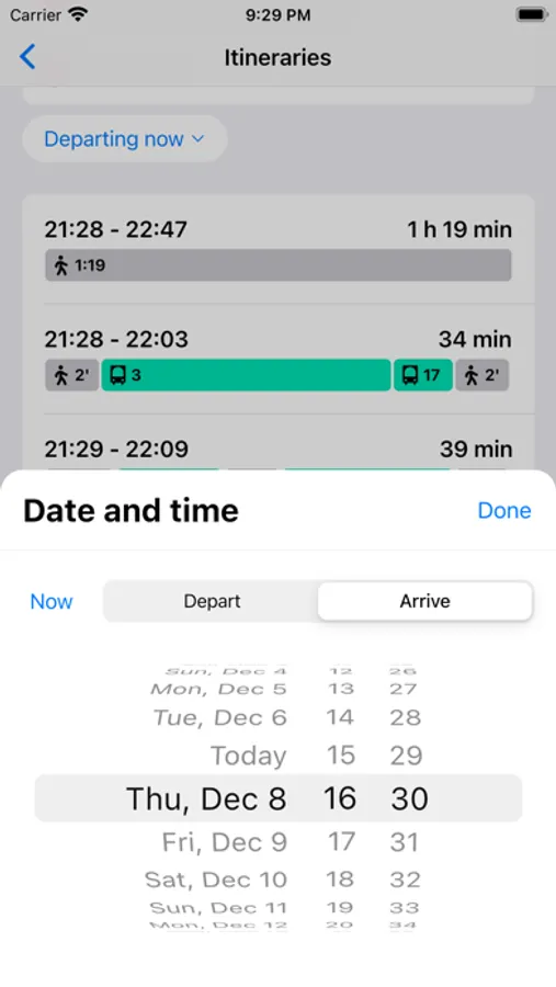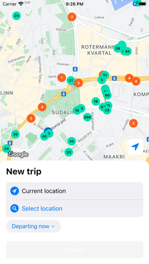 All of those things can be done with the Vedu app. You can create trips with public transport in Tallinn, plan them for a specific arrival or departure time, and you can see the transport you're looking for on the map!