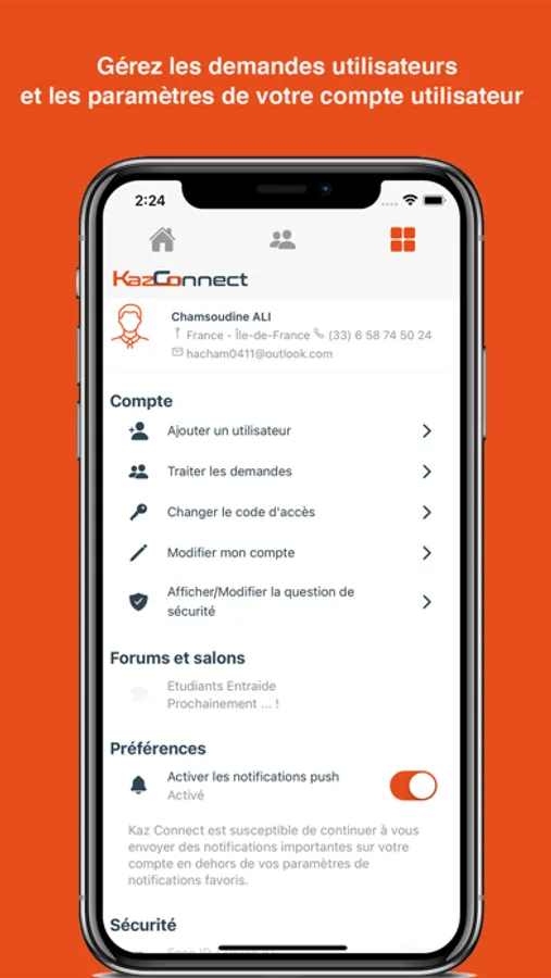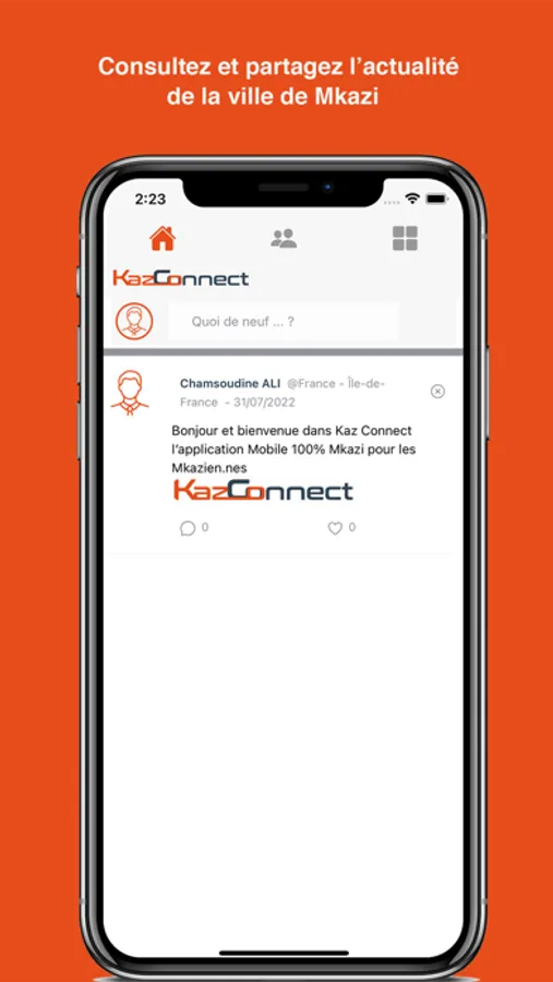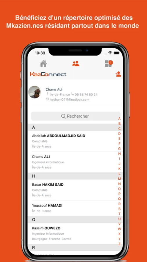 Plus qu'un réseau social, Kaz Connect est une application qui permet aux utilisateurs de se connecter à tous les Mkazien.nes du monde entier. Les informations des contacts sont toujours à jour et sécurisées !