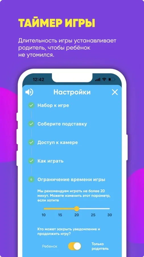 - Рекомендуем играть по 20 минут в день, лимит времени на игру устанавливается родителем.