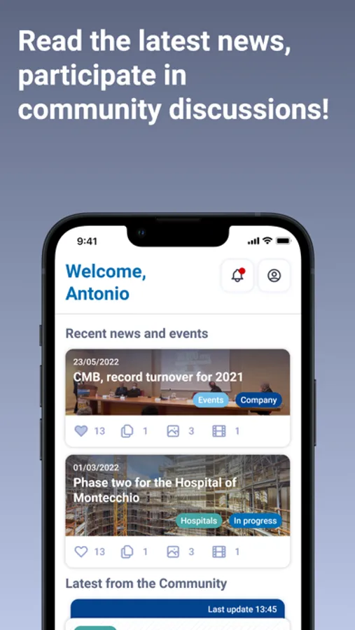 CMB Cooperativa Muratori e Braccianti di Carpi is a construction company specialized in hospital and civil work. With over a Century of experience, CMB builds its future on people and their professional skills, capable of enhancing projects both in the construction sector and in infrastructure and facility management. The new CMB app will allow all employees and company members to receive updated news and communicate easily with each other.