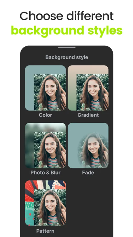 - Select the style of filling background. Choose between: color fill, gradient fill, fade, blur photo or stylish pattern.