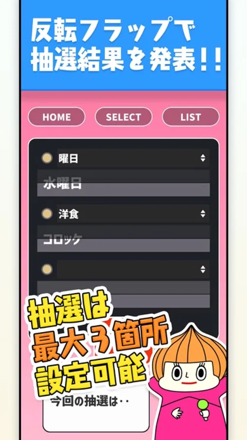 抽選したいリストを最大3つまでセットして、抽選結果をランダムに表示します。