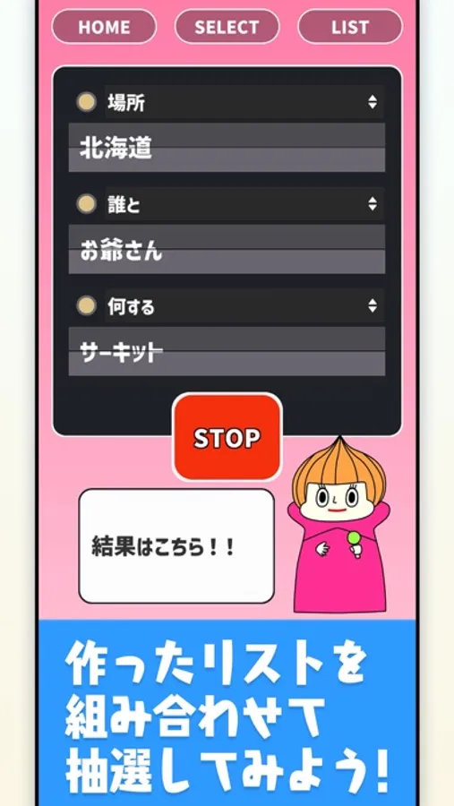 例えば、【場所】【人】【食べ物】のリスト作って抽選すれば