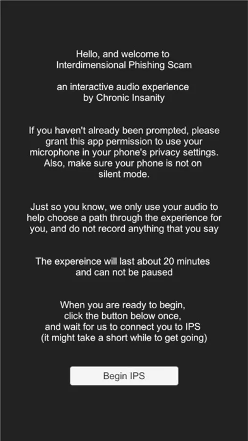 Interdimensional Phishing Scam is an interactive audio experience where you receive a phone call about some PPI compensation that pulls you through a series of different call centres from parallel universes in a randomly generated show full of surreal comedy and unforeseen consequences.