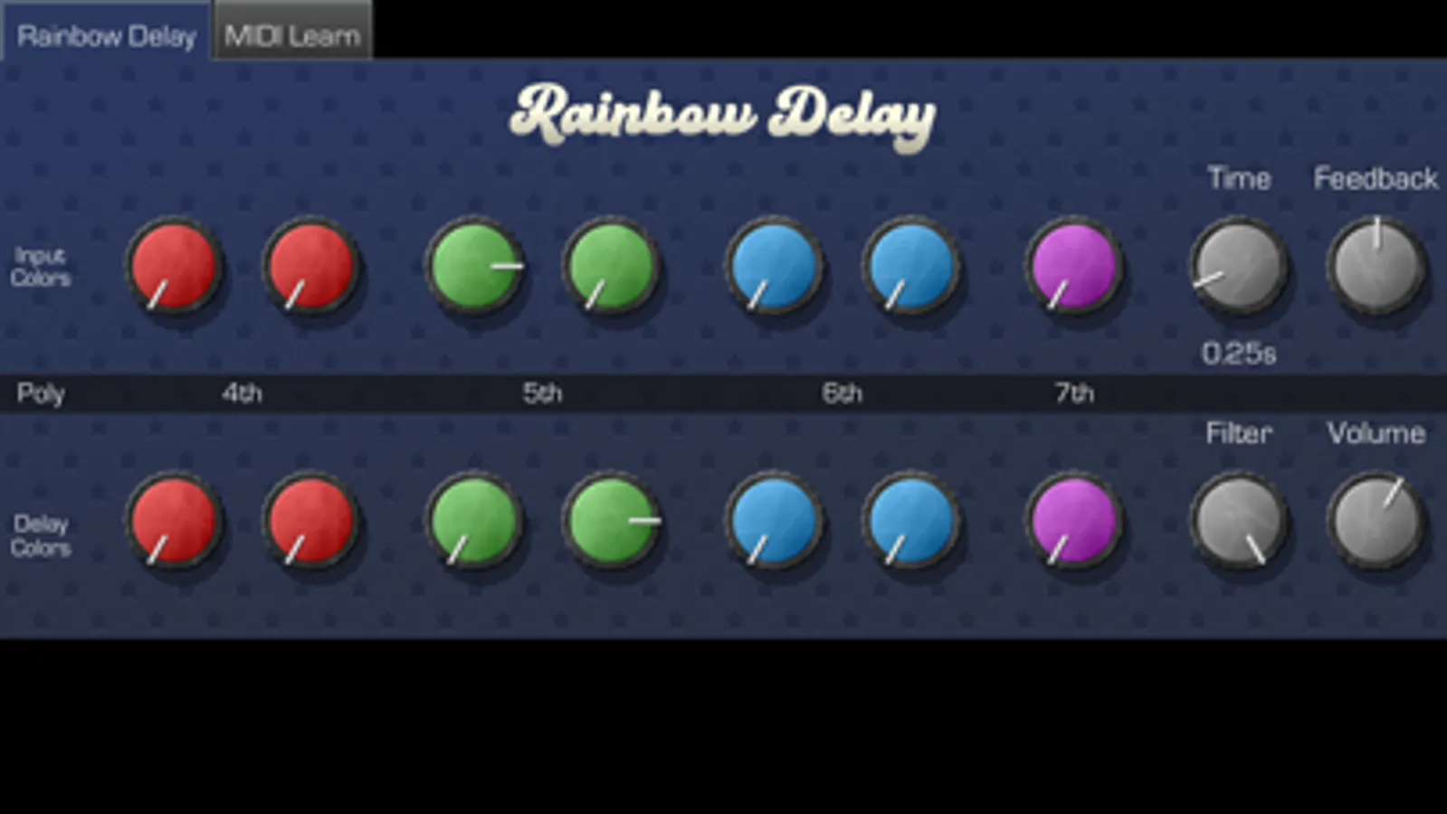 Rainbow Delay is a polyphonic harmonizing delay effect unlike any that you've played before. Harmonize full chords with multiple different intervals at once to create colorful soundscapes you didn't know your guitar could create. Program your MIDI controller to control your harmonies and delay in real time. Switch it into Mono mode for vocals and other monophonic instruments.
