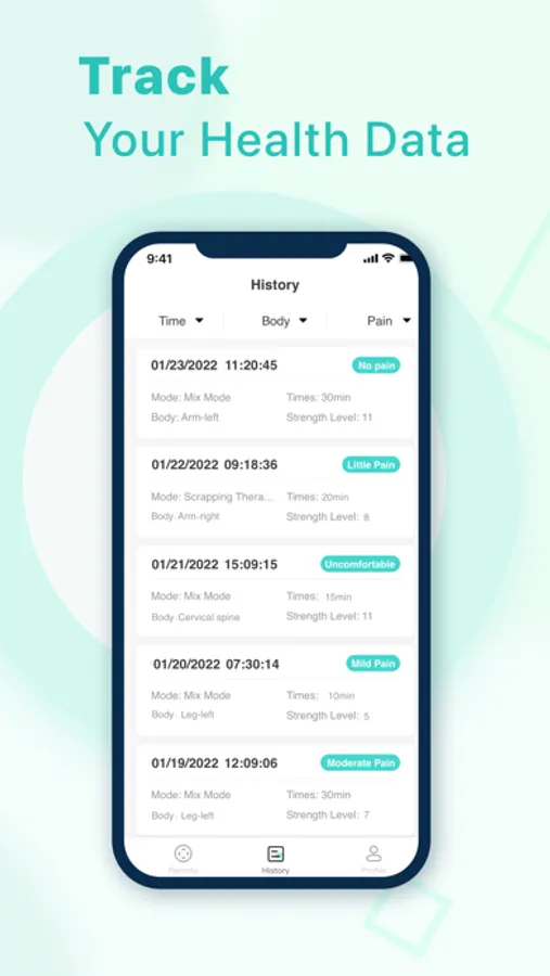 MyPainOff connects wirelessly via Bluetooth to Easy@Home TENS and EMS device and controls the massage therapy location, pain level, massage intensity, massage time and mode easily from your smartphone. Try all modes like acupuncture, cupping jar and traditional massage. Track the body location and intensity of your pain relief therapy session to view your progress over time.