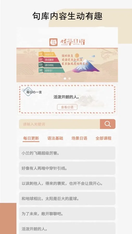 本软件每天更新中日翻译热词。提供给广大学习者有趣的最新的日语知识。