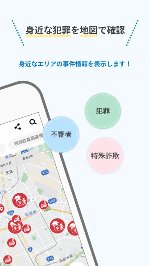 犯罪発生情報、不審者情報、特殊詐欺関連情報をアプリ上のマップに表示します。