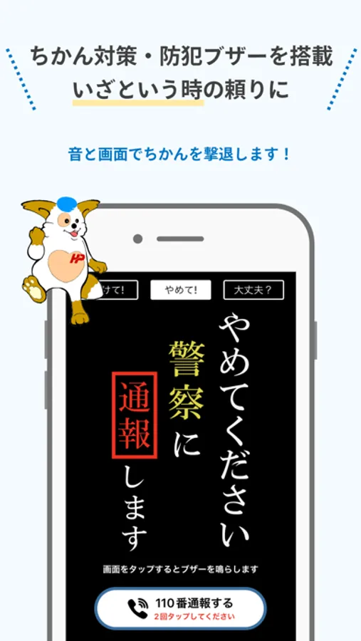 画面をタップして音と画面表示で、ちかんを威嚇するとともに、事前に登録した家族等に、現在地をプッシュ通知又はメールで送信します。