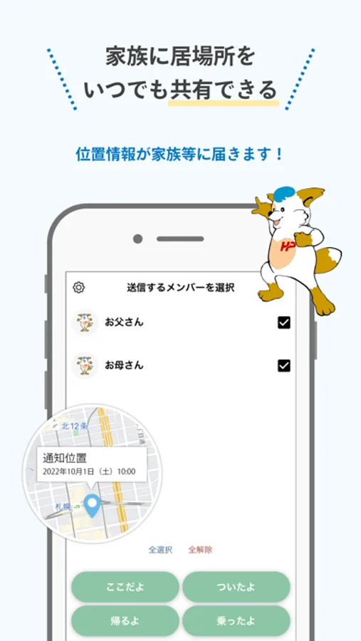 画面上のボタンをタップして、事前に登録した家族等に現在地を簡単なメッセージを添えてプッシュ通知で送信します。