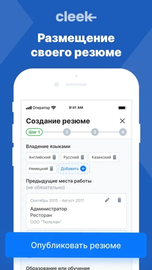- Фильтрация предложений по зарплате или условиям, создание резюме, отклик сразу на несколько вакансий.