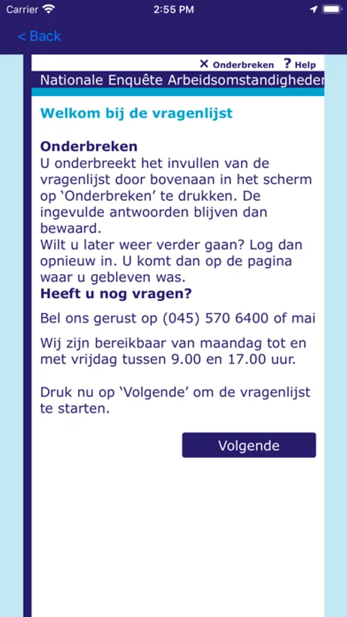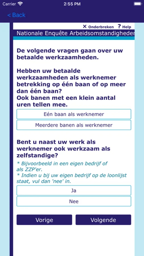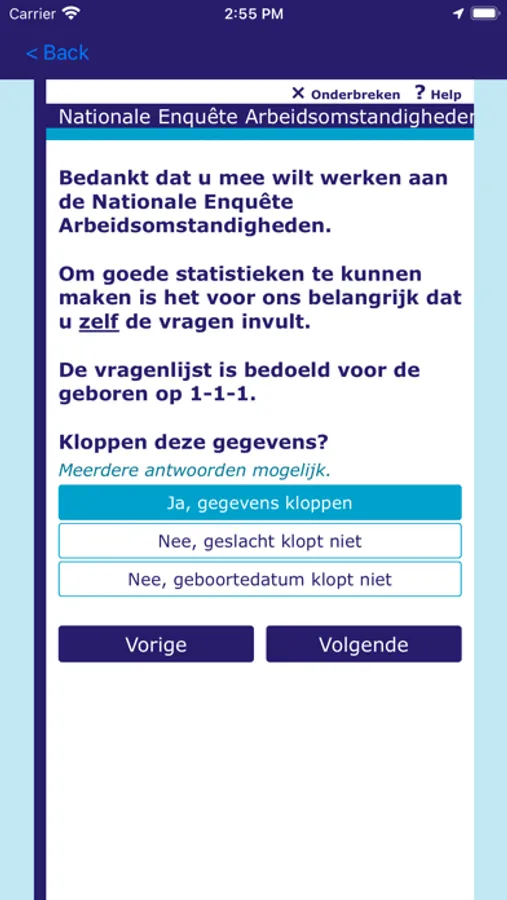 This app can be used for both online and offline surveys. For online surveys it is required to have an internet connection for the duration of the survey, since the survey is running on a Blaise server park in this case. The app sends the answers to the questions to the server and the server calculates a response based on the given answers and the rules and checks that have been defined for the survey. The response is sent back to the app and displayed to the user.