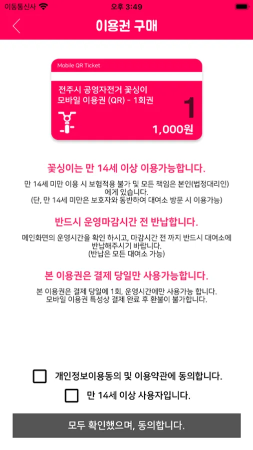모바일 이용권 결제 후 자전거를 편리하게 대여할 수 있습니다.