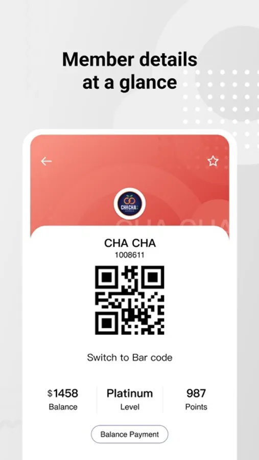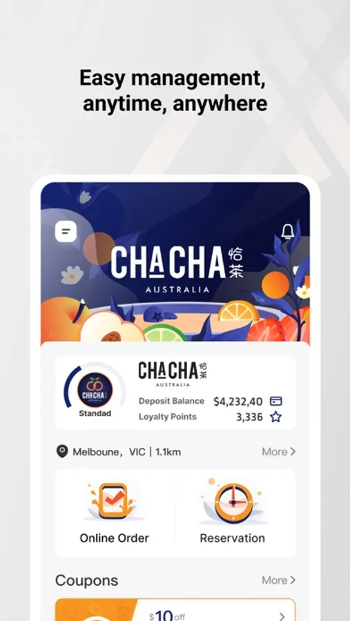 Manage your loyalty member information and enjoy a variety of member services (points, coupons, birthday gifts, event promotions, etc.) provided by the Cha Cha. Follow your consumption information in real time.