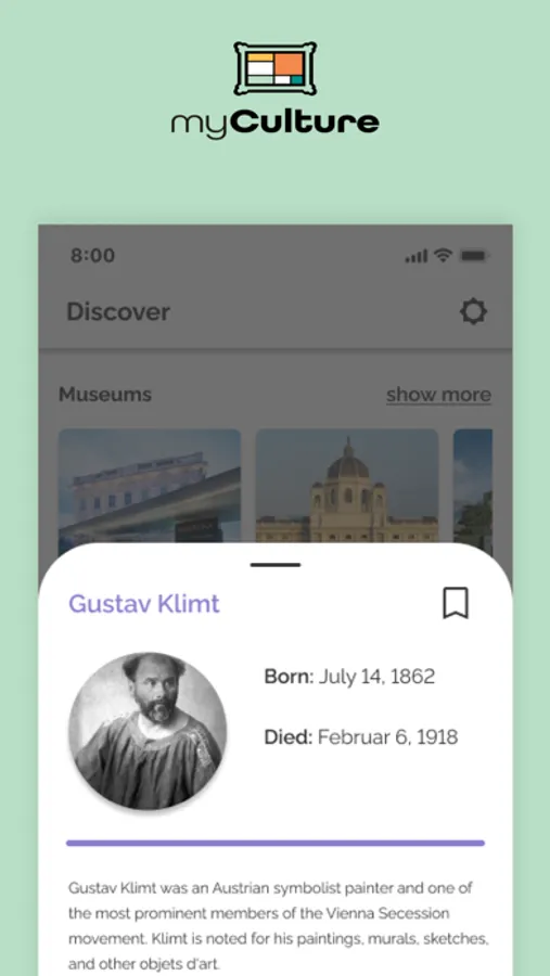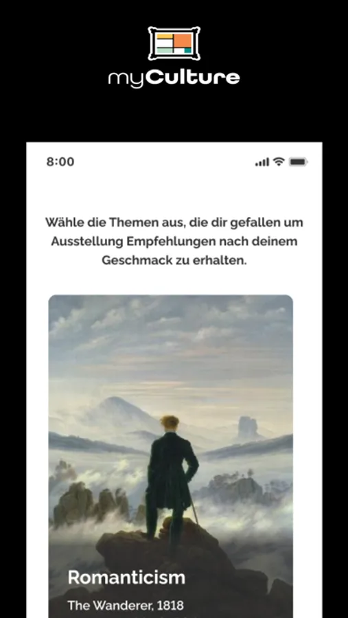 myCulture inquires about your initial art interests in a fun and familiar way and learns more about your art taste the more you use the app, so you can spend less time planning your museum visit and more time simply enjoying the art.