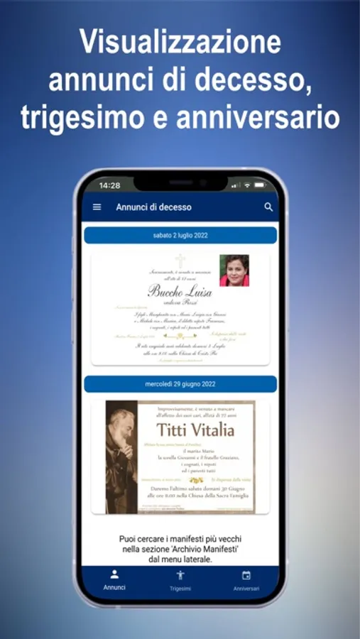 • giorno per giorno, gli annunci di decesso gli anniversari e i manifesti di partecipazione.
