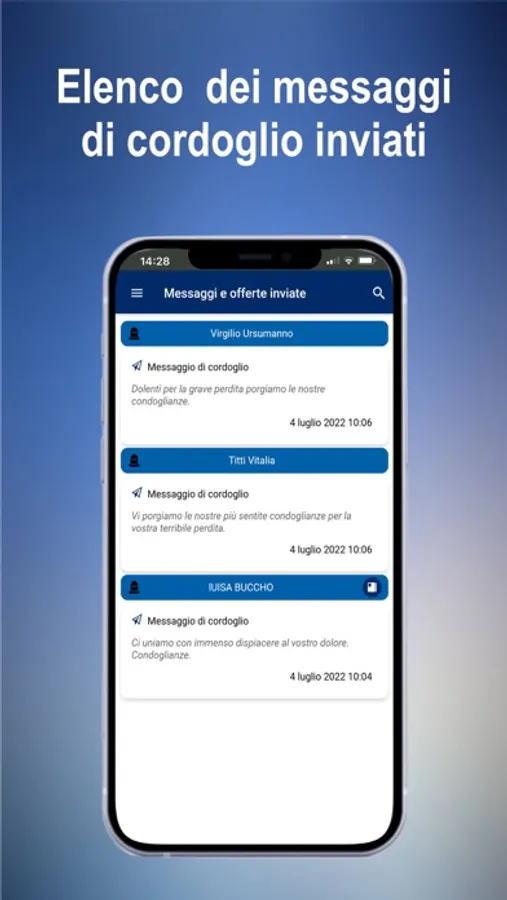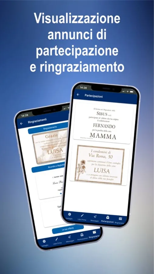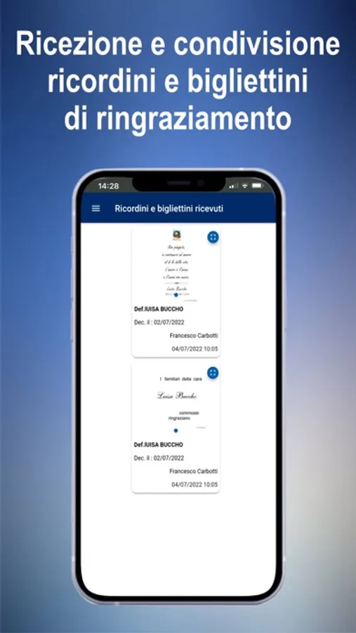 L’app mobile Del Prete Onoranze Funebri è una risorsa tecnologica valida per essere vicino e sostenere la famiglia del defunto, contribuendo alla creazione di una comunità virtuale unita, anche se lontana fisicamente, in un sentimento umano di vicinanza ed affetto: grazie ai nostri sistemi ed un semplice click, è possibile inviare messaggi di cordoglio ai famigliari del defunto, e ricevere bigliettini e ricordini di ringraziamento della persona scomparsa da ogni parte dell’Universo!