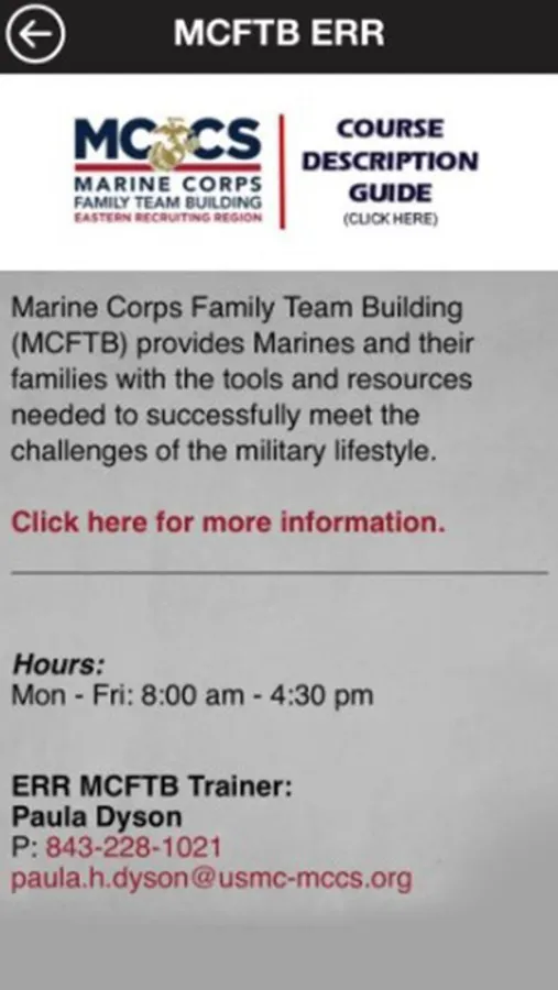 This app provides information about resources available to Marines in the Eastern Recruiting Region: 1st, 4th, & 6th Marine Corps Districts.