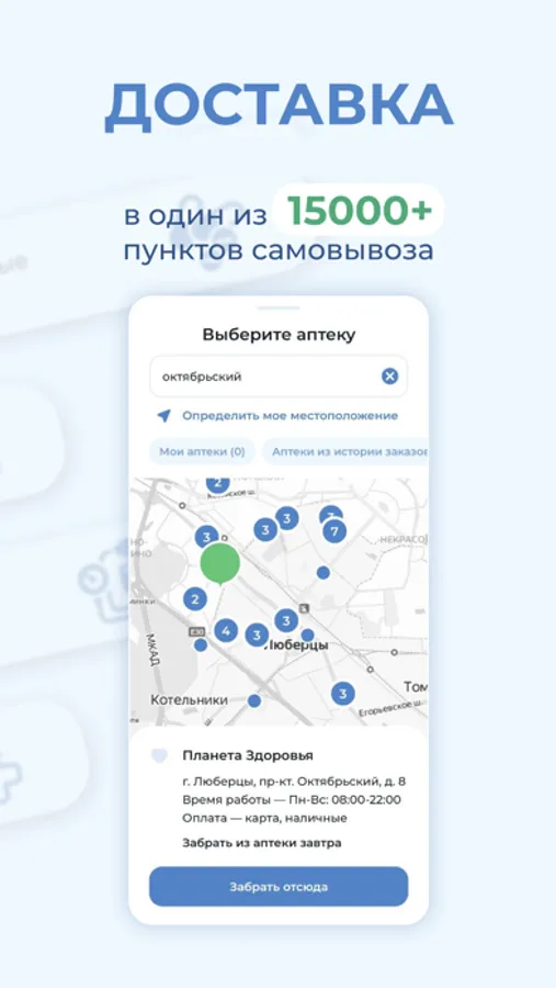 Вы можете оформить заказ и забрать его в любое удобное время в аптеке или пункте выдачи рядом с домом или работой: