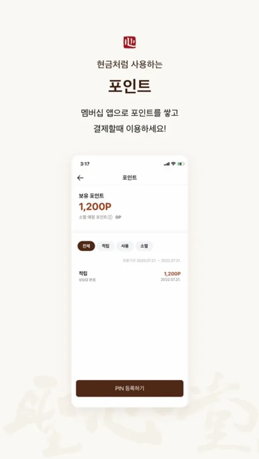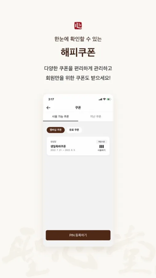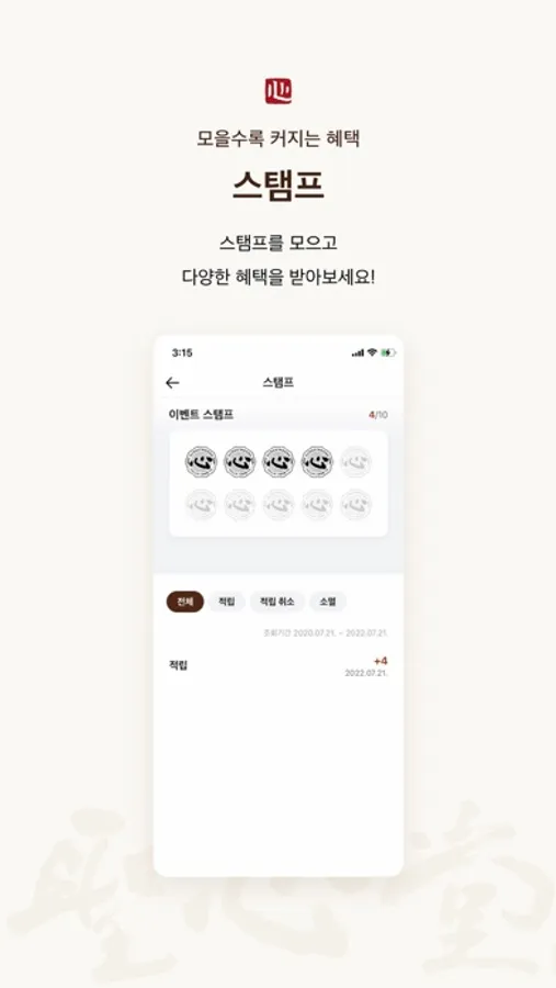 - 스탬프 : 스탬프를 적립하고 적립 내역 및 유효기간을 확인할 수 있습니다.