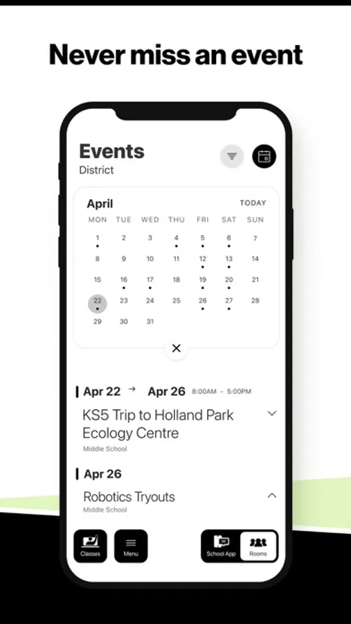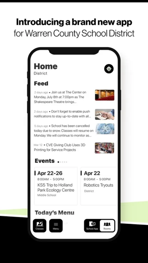 The event section shows a list of events throughout the district. Users can add an event to their calendar to share the event with friends and family with one tap.