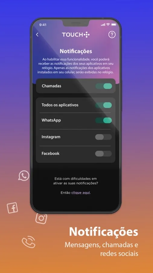 Receba notificações das suas redes sociais favoritas, diretamente no seu pulso! Além de ligações e mensagens de texto.