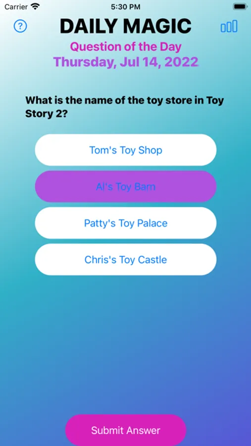 A new question each day about the most magical movies and characters! Your statistics will be calculated so you can see how you stack up in your expertise.