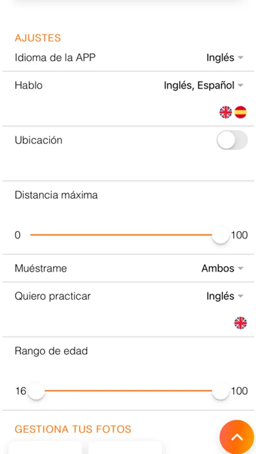 2. Configura tus búsquedas. Elige el rango de edad, la distancia máxima de búsqueda y los idiomas que quieres aprender o mejorar.