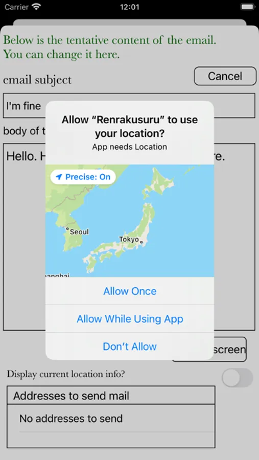 Insert "longitude/latitude information of current location" into the body of email or SMS
