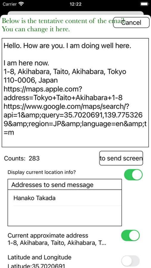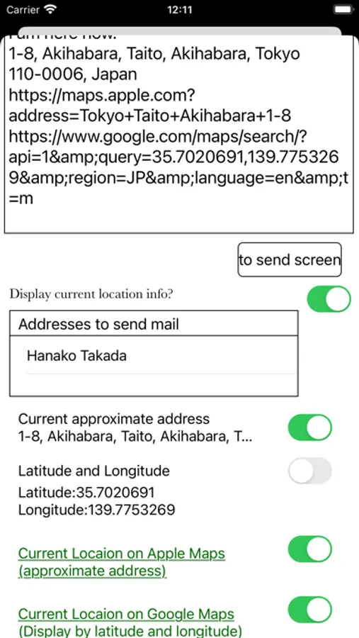 You can enter your current location information in the body of emails and SMS with just a few taps. This eliminates the need to launch other apps to check and obtain current location information.