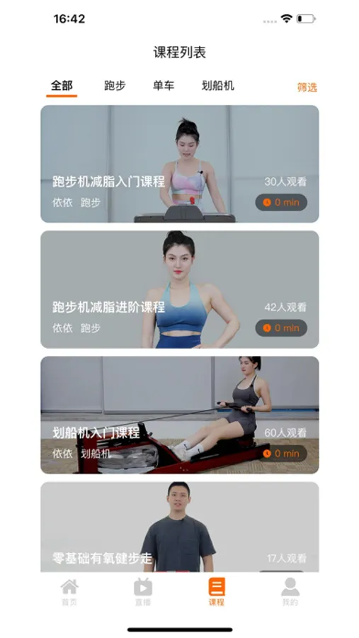 软件具有直播和课程等模块,包含了跑步机、健身车、划船机等设备的教学,还可以看自己的运动数据以及历史记录。
