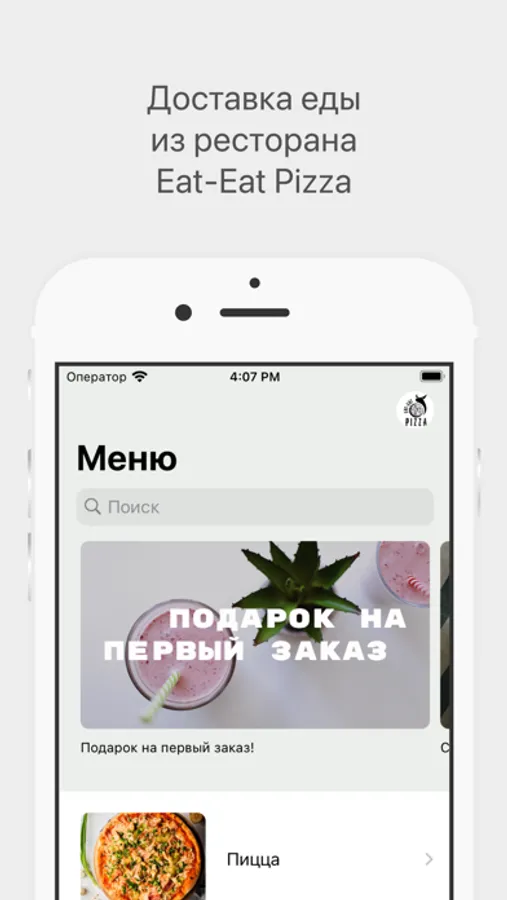 Как сделать заказ в приложении “Eat-Eat Pizza”: выберите понравившиеся позиции из меню, добавьте их в корзину и перейдите на экран оформления заказа (по нажатию на иконку корзины).