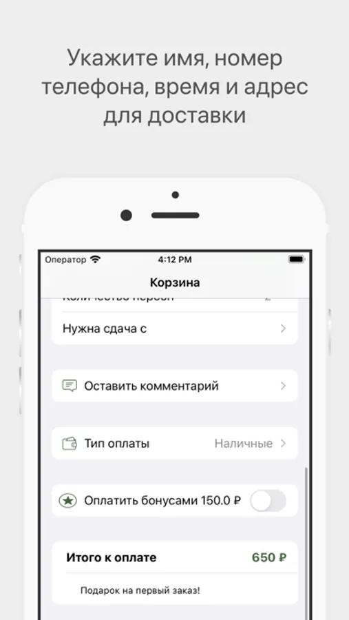 На экране заказа добавьте свою контактную информацию для первого заказа: Имя, Номер телефона и адрес электронной почты, чтобы получать уведомления об оплате.