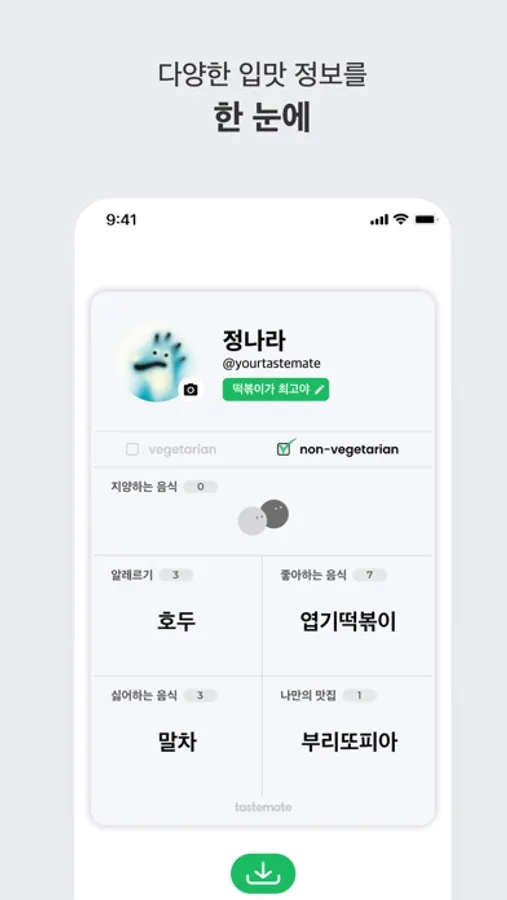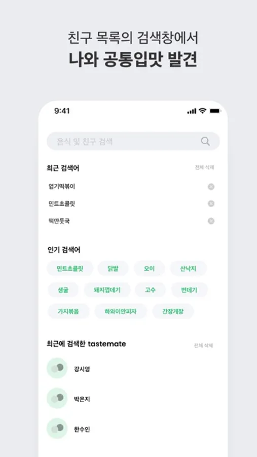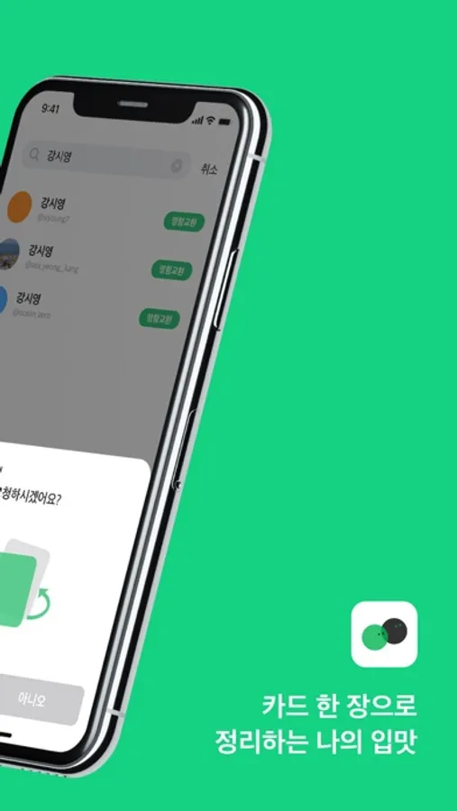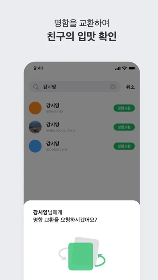 친구 아이디를 검색해 명함 교환 요청을 보내보세요. 명함을 교환하면 서로의 입맛을 언제든지 확인할 수 있어요.
