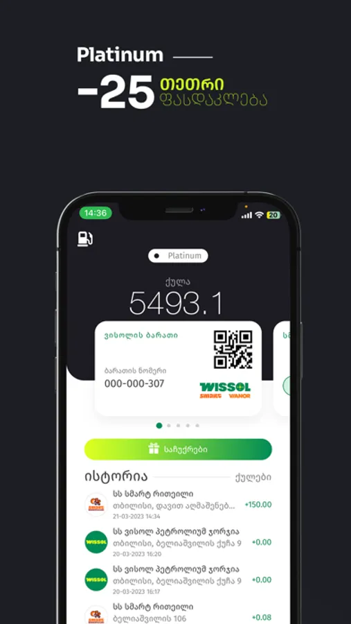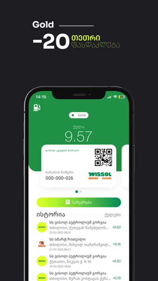 The mobile application gives you an opportunity to save on fuel from 15 to 25 Tetri per Litre. You can get Silver, Gold or Platinum Card according to monthly purchases at Wissol, Smart and Vianor. Earn back 1 % of every purchase through reward points and choose gifts. You will be the first to know the latest news about hot discounts and offers.