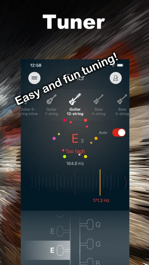 - Manual tuning mode to tune a specific string by tapping the according tuning peg