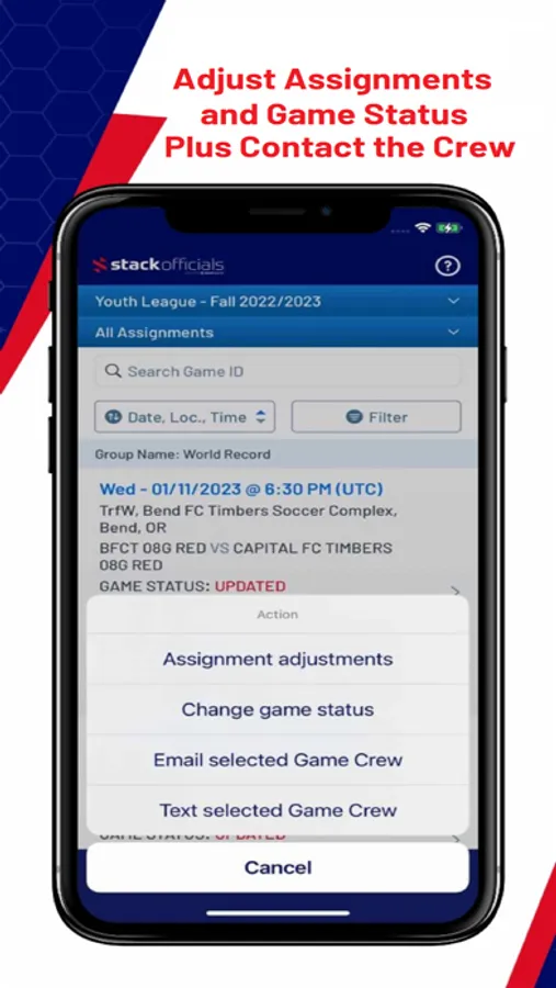 Game Status Updates: When a game is canceled or rescheduled, the assignor can use the app to update to the new date and time and communicate changes out to the officials crew assigned to that game.