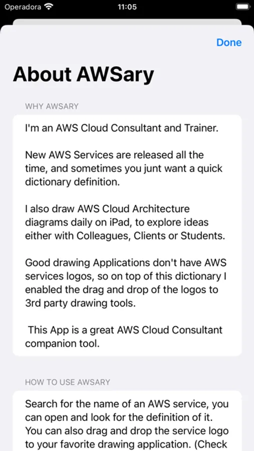 With this app, you'll have access to a comprehensive AWS dictionary, allowing you to easily search and learn about various AWS services. Need to create AWS Cloud Architecture diagrams? AWSary has you covered there too - simply drag and drop the service logos into your preferred drawing application. Plus, with regular updates and new content added, you'll always have the most current information at your fingertips. Download AWSary today and take your AWS knowledge to the next level!