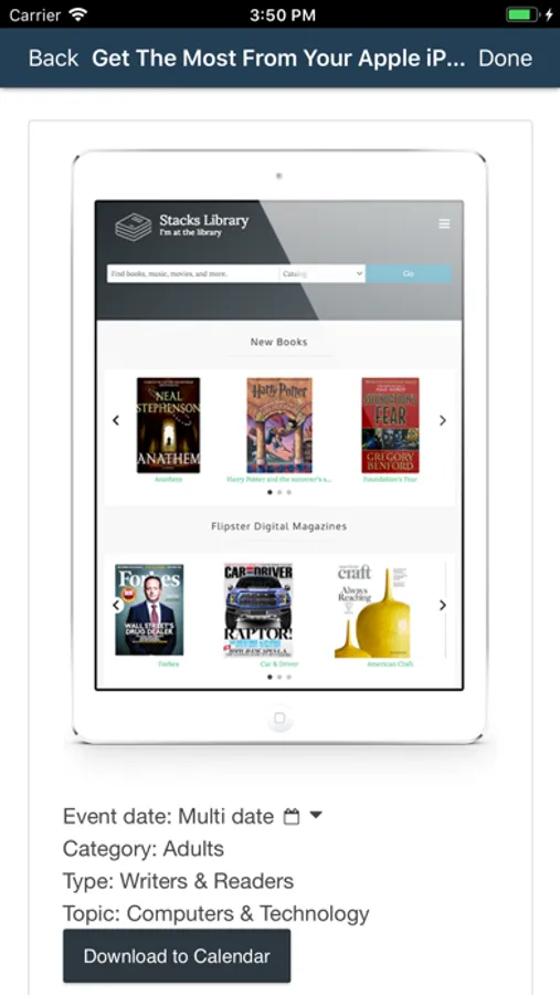 Access the information and resources you need from anywhere, anytime. Configurable features for information providers include integrated search, including the ability to scan volume barcodes, and learn of upcoming events at your local library.