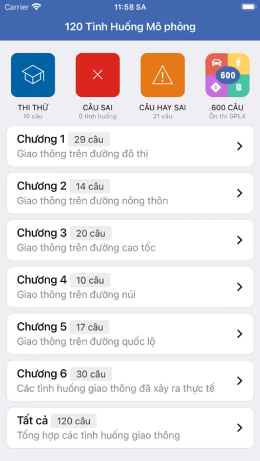 "120 câu mô phỏng GPLX" bao gồm 6 chương: