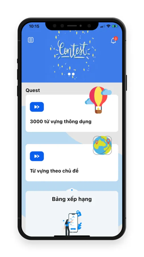 ứng dụng học tiếng anh, qua nhiều phương thức, phương thức chính là trả lời trắc nghiệm, nhớ tự vựng. Gơi ý, video liên quan tới từ vụng giúp học viên nhớ được từ vừng dễ hơn