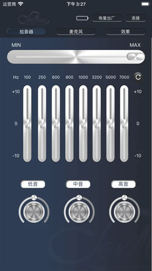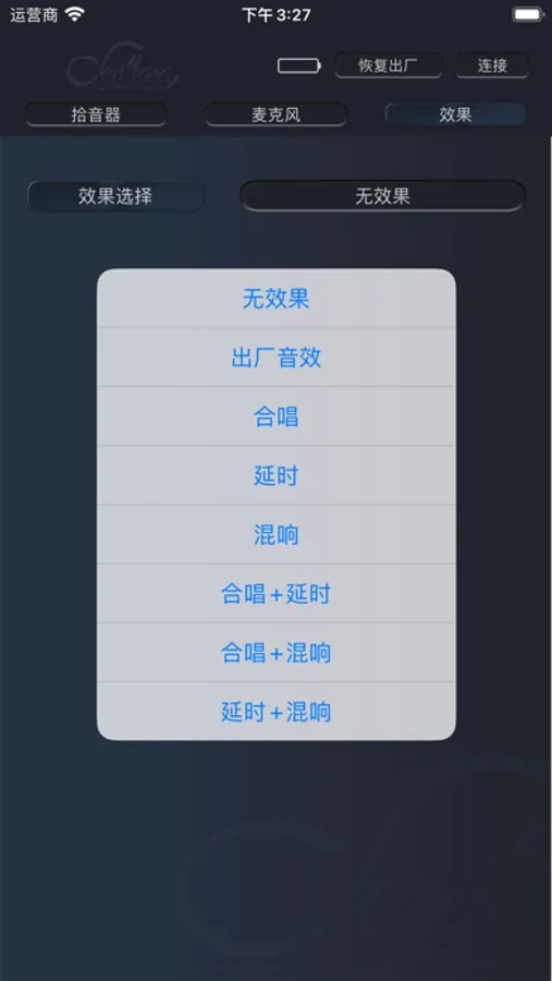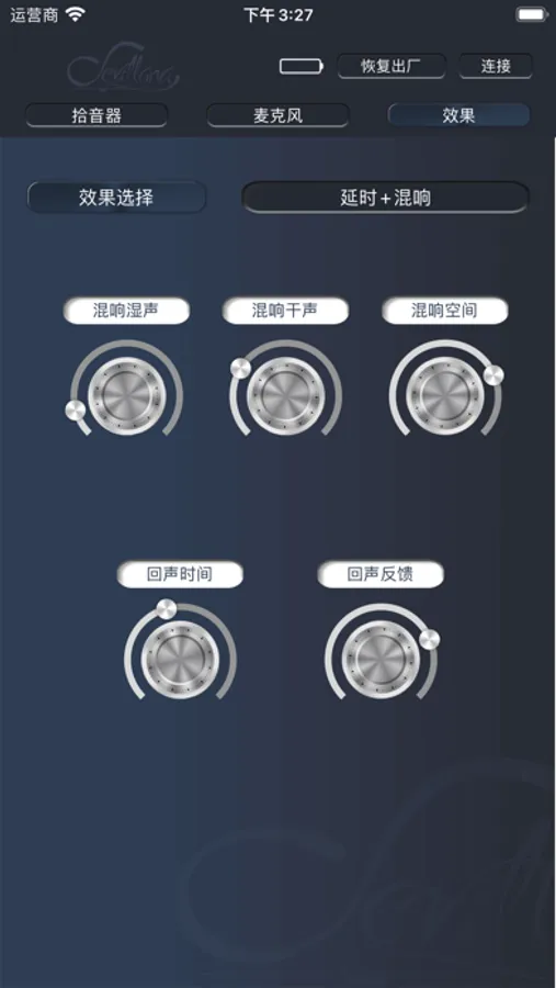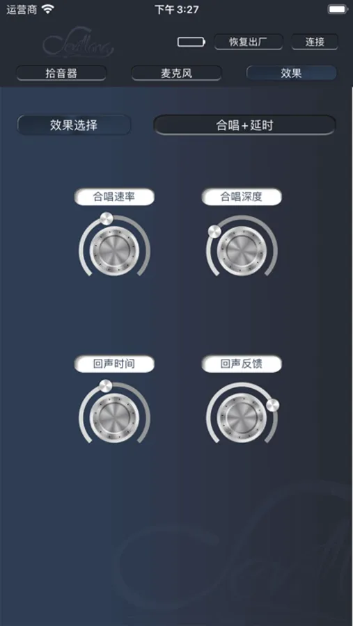 用这款APP通过蓝牙连接对应的拾音器之后,可以远程调节的拾音器。有拾音器、麦克风音量调音,而且还各有多路均衡值调节。效果页面可以调节合唱、延时、混响等效果,还有相互的组合效果。